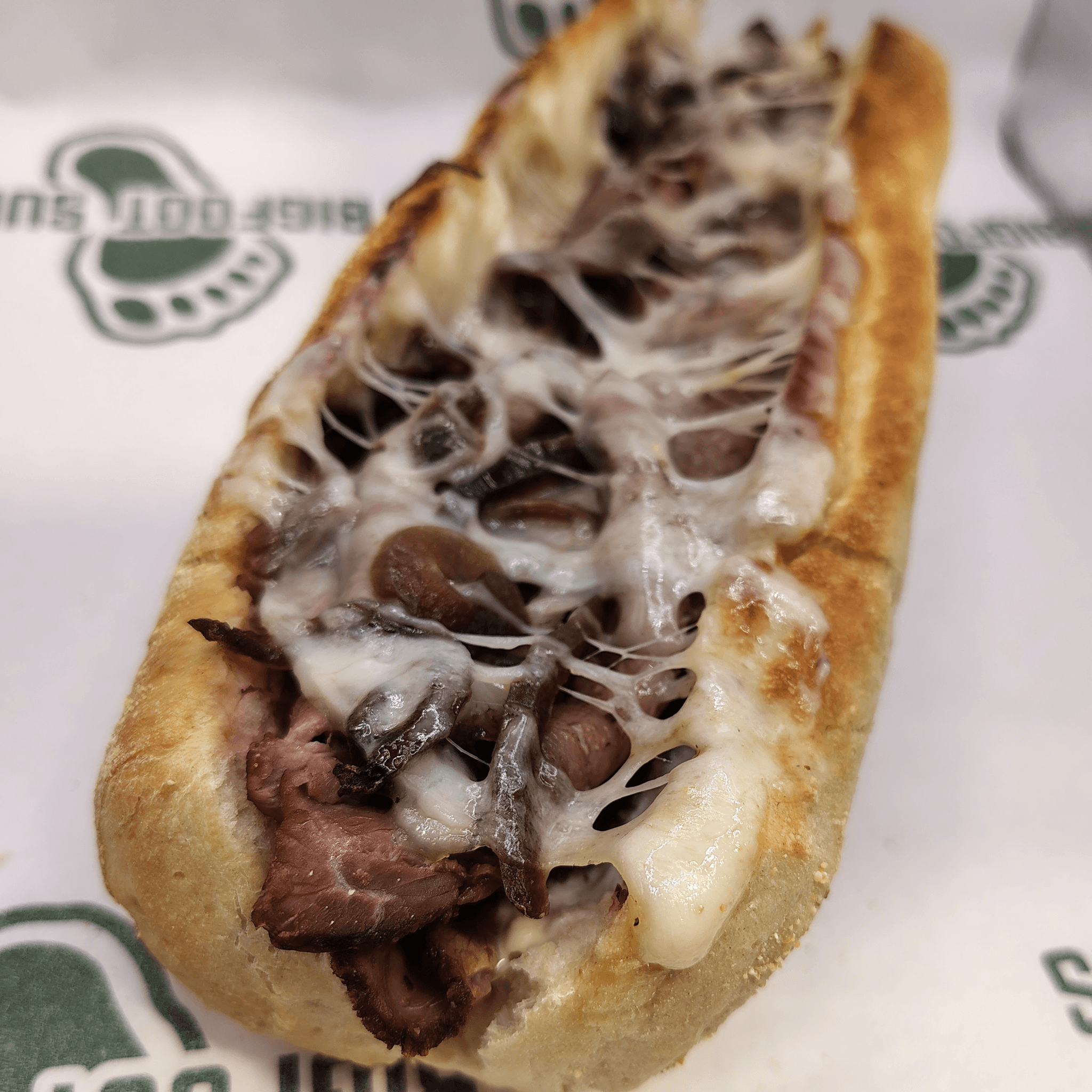 Seasoned London broil roast beef, horseradish sauce, sharp provolone, topped with caramelized red onions, oven-toasted with au jus on the side