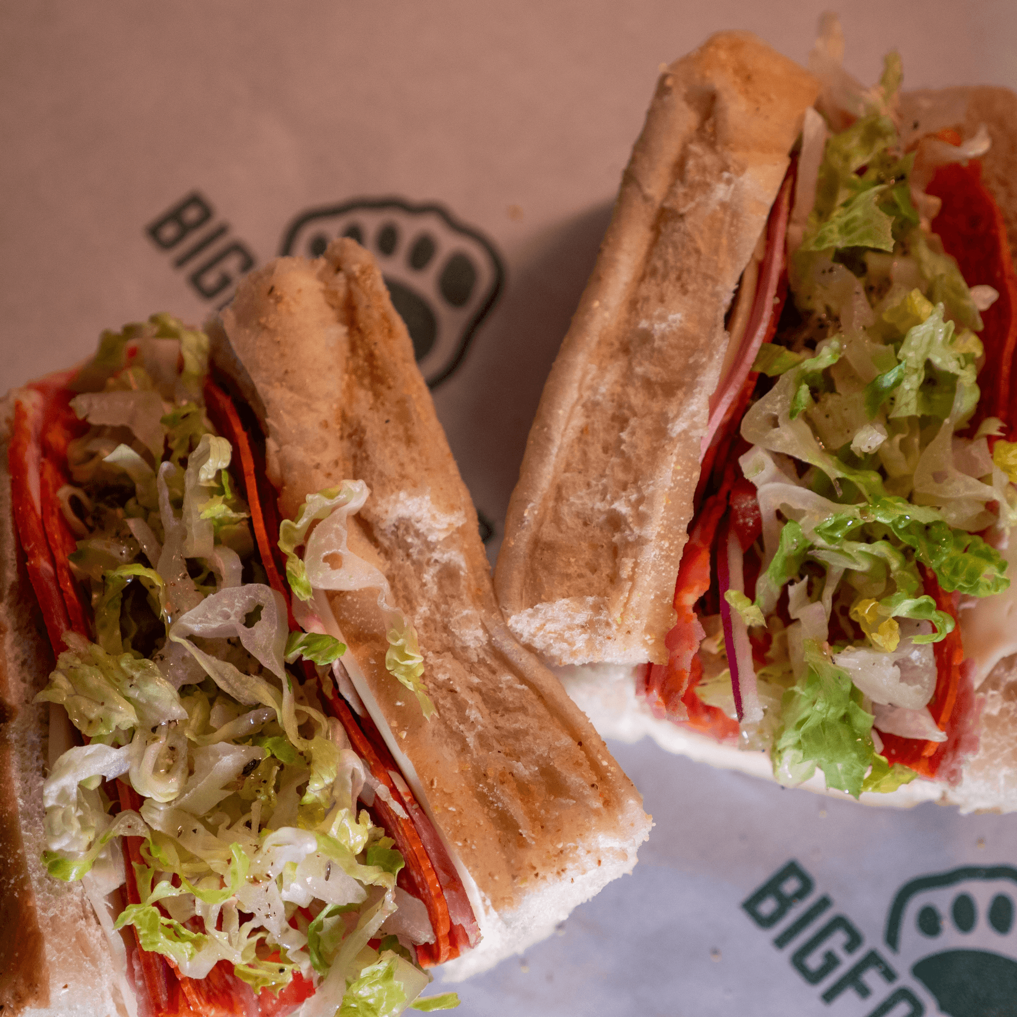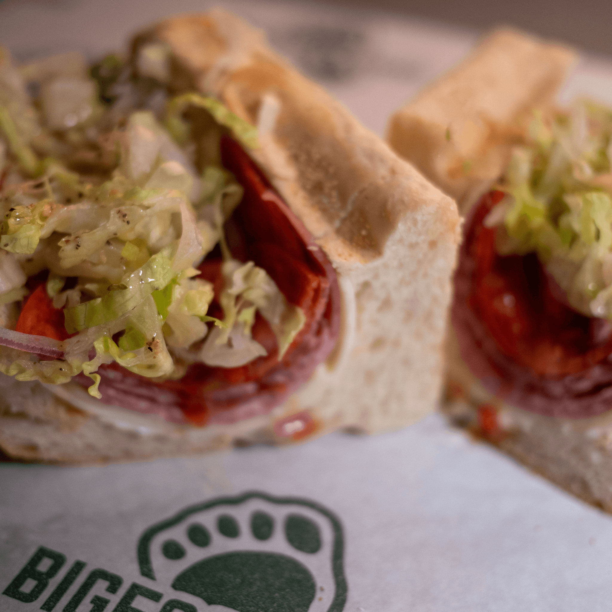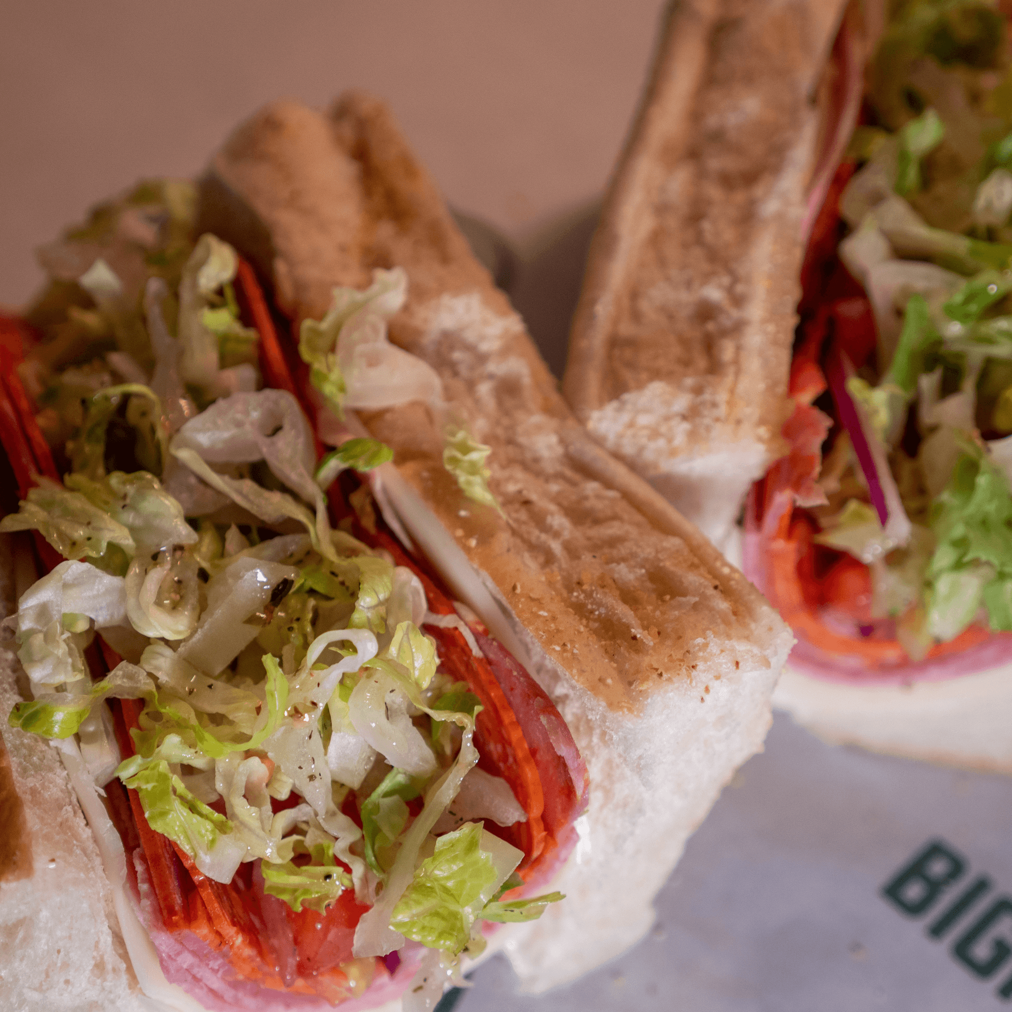 Hot sopressata, pepperoni, genoa salami, sharp provolone, hot pepper blend, red onions, tomatoes, shredded lettuce, basil mayo & culinary lube