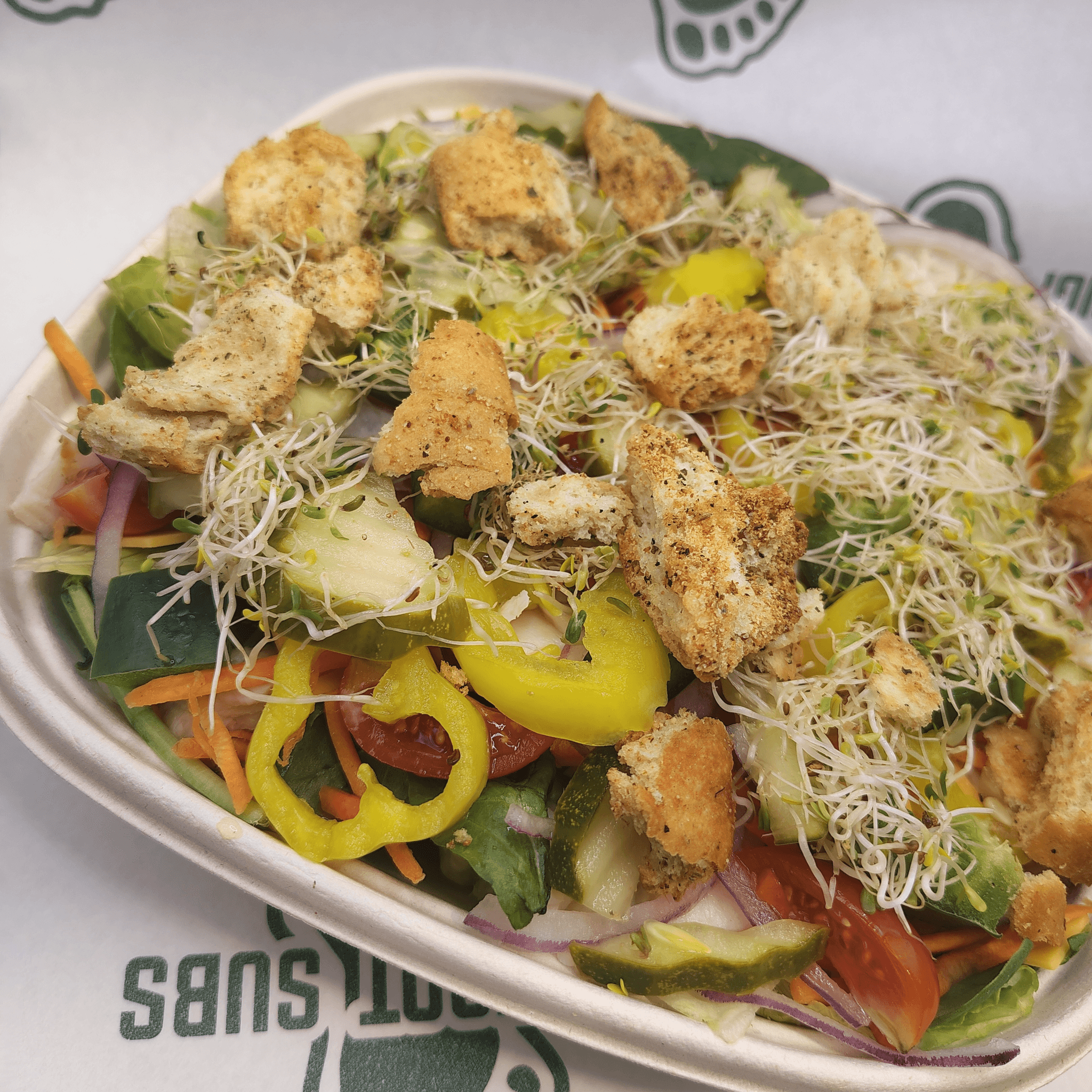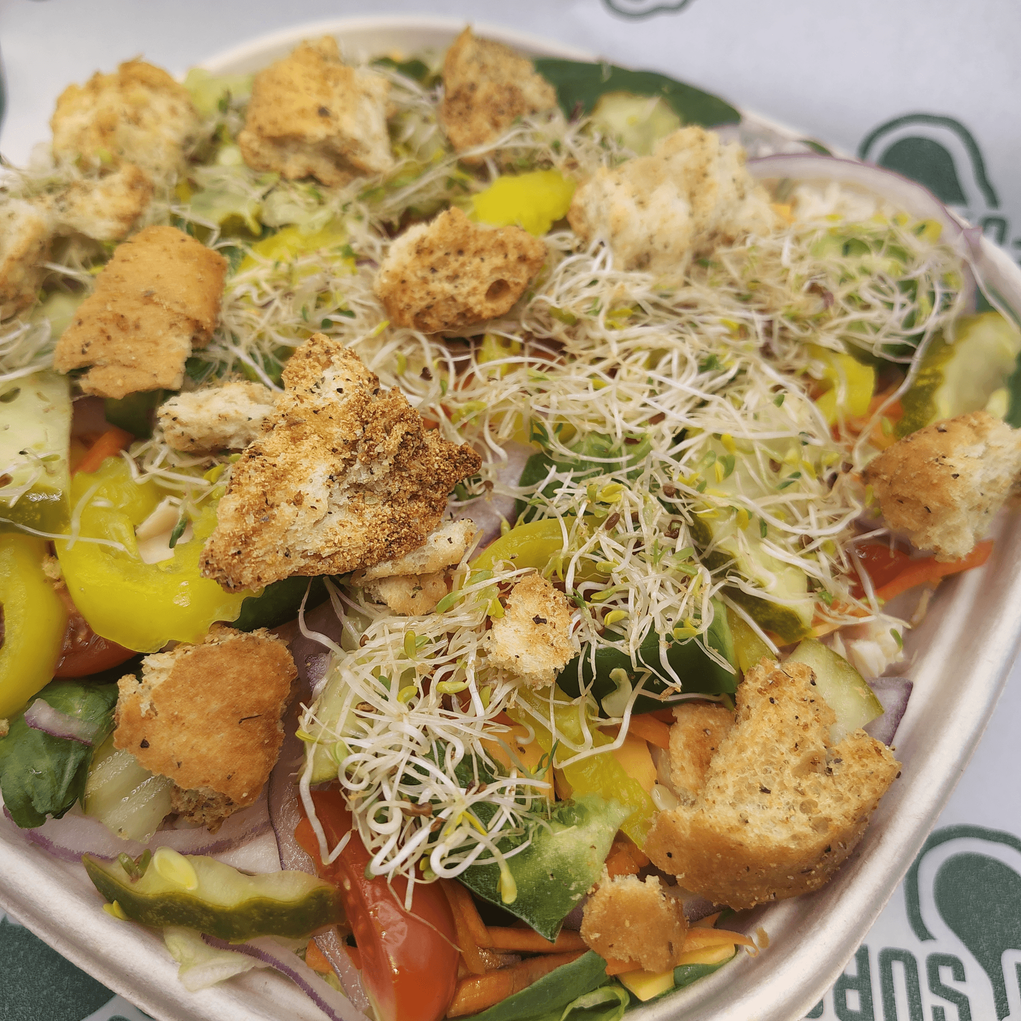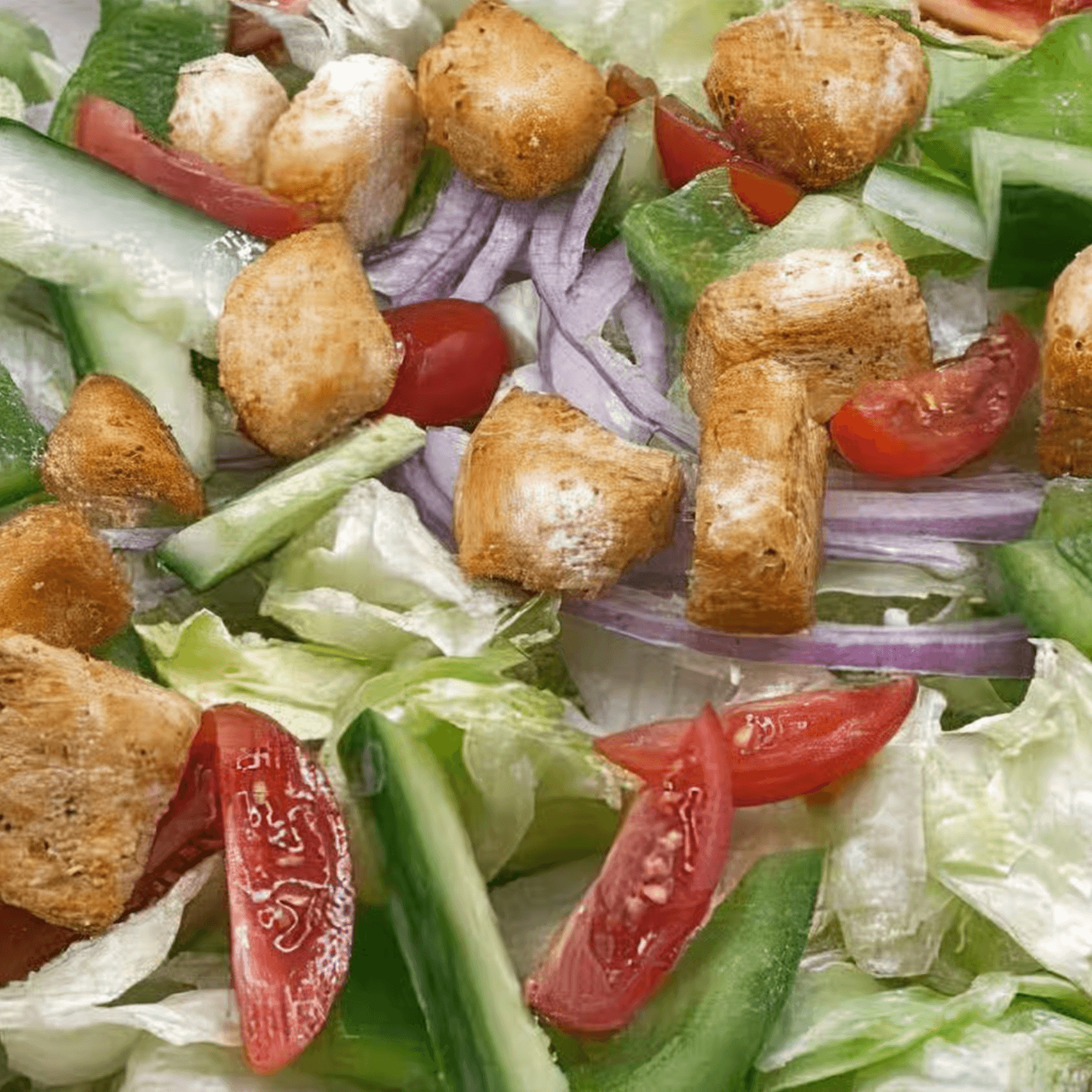 Mixed greens, cucumbers, grape tomatoes, red onions, shaved carrots, bell peppers & croutons with choice of dressing