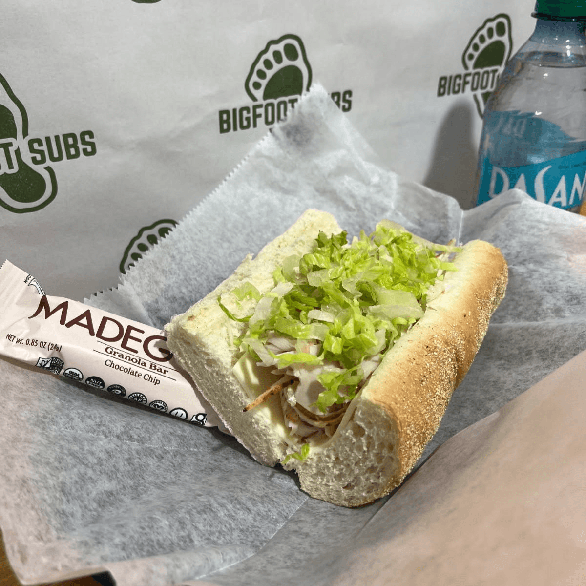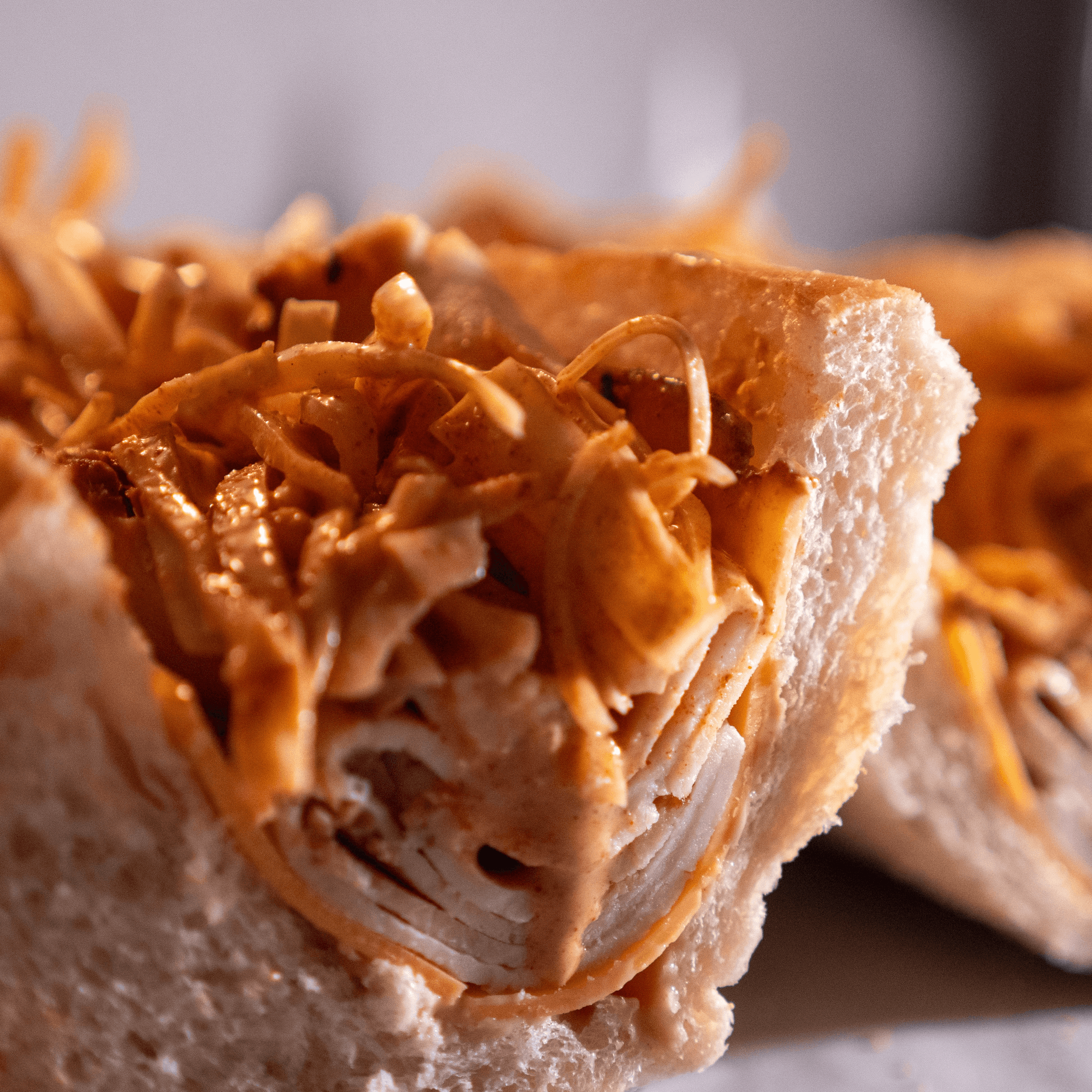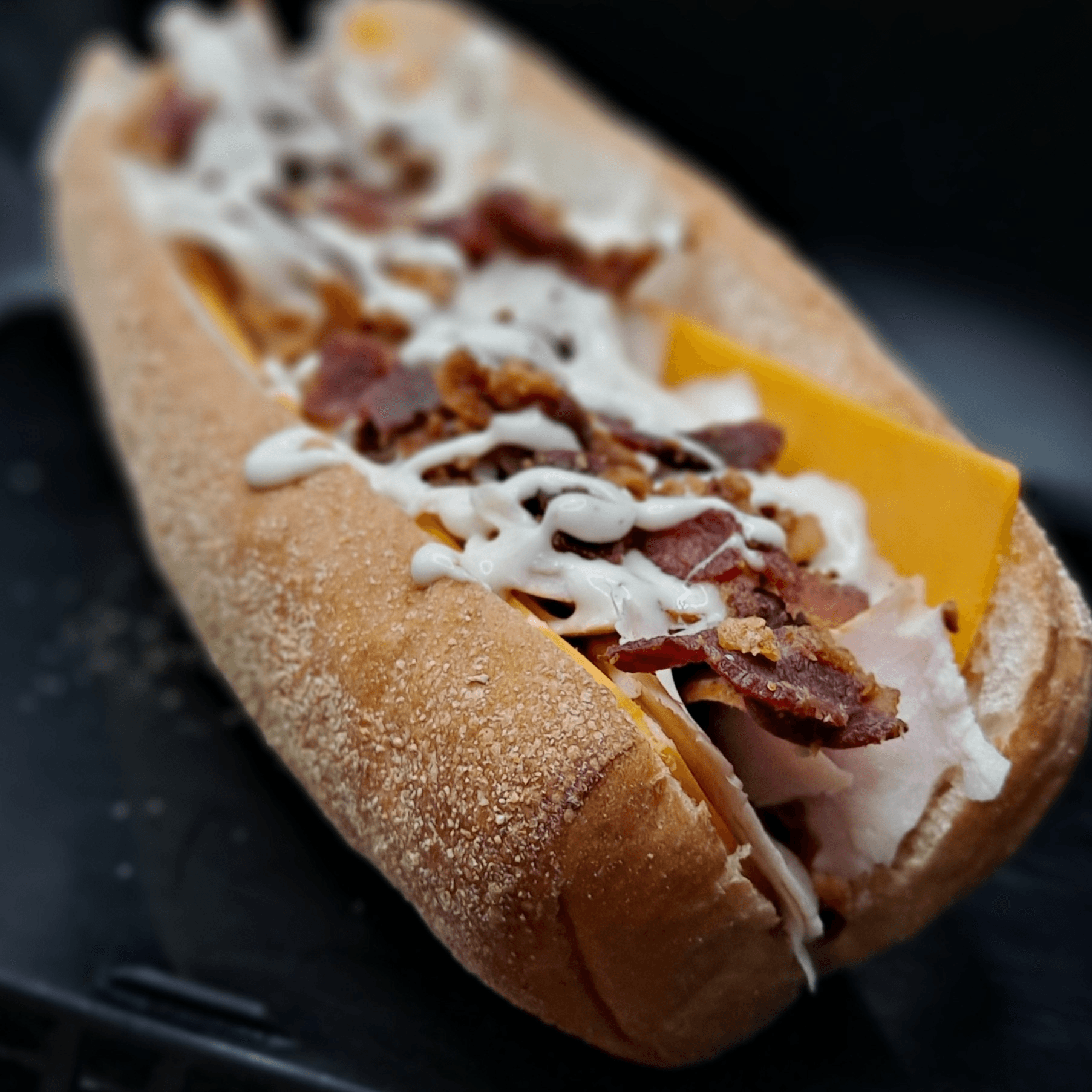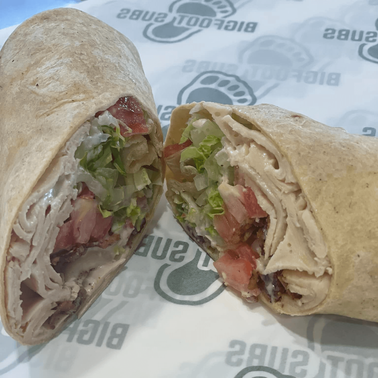 Ovengold turkey, bacon, Vermont cheddar, avocado, Romaine, tomato, red onion drizzled with spicy chipotle gourmaise
