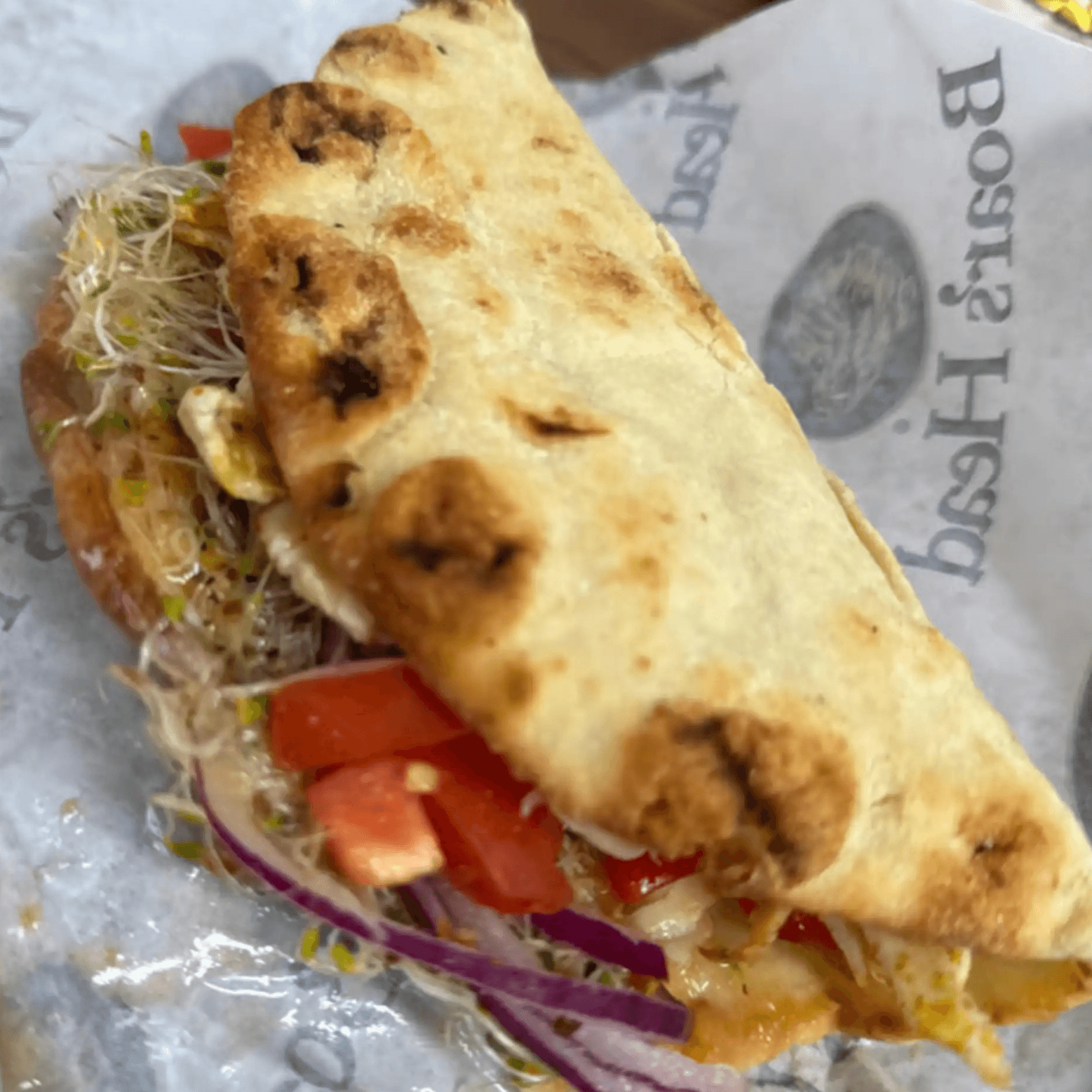 Curry chicken, tomatoes, sprouts, red onions, mango chutney & citrus vinaigrette served on warm naan bread
