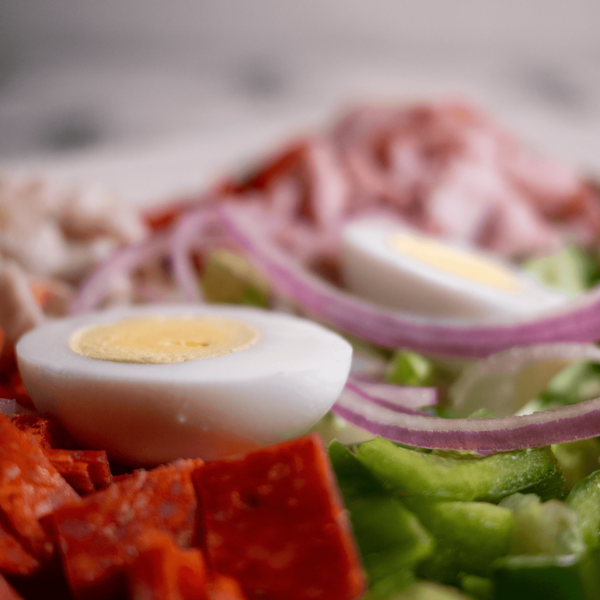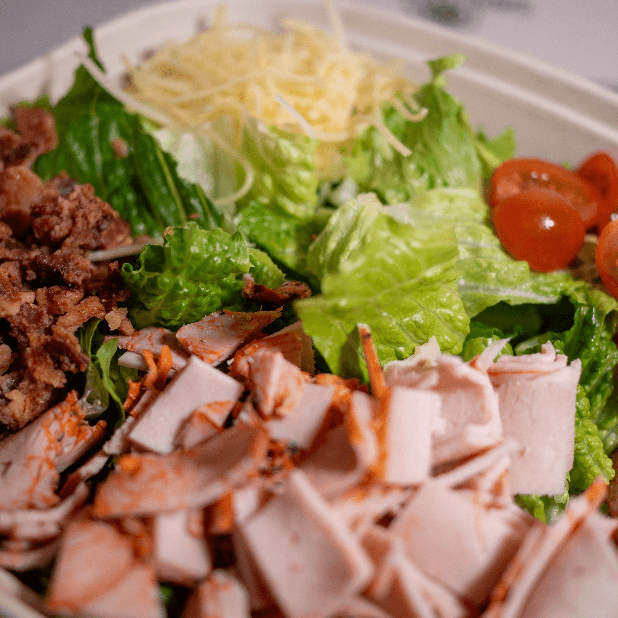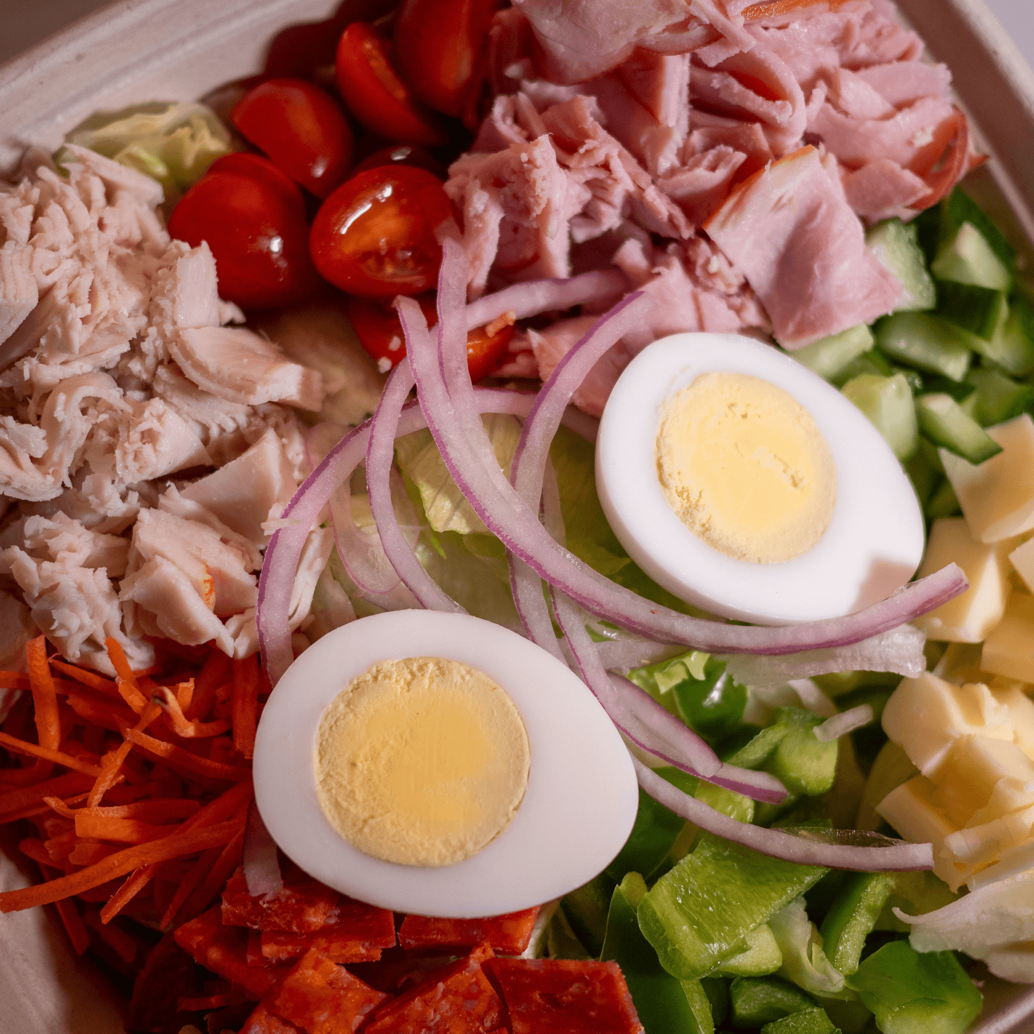 Chopped iceberg lettuce, black forest ham, ovengold turkey, pepperoni, provolone, grape tomatoes, red onions, shaved carrots, cucumbers, bell peppers & hard-boiled egg with choice of dressing